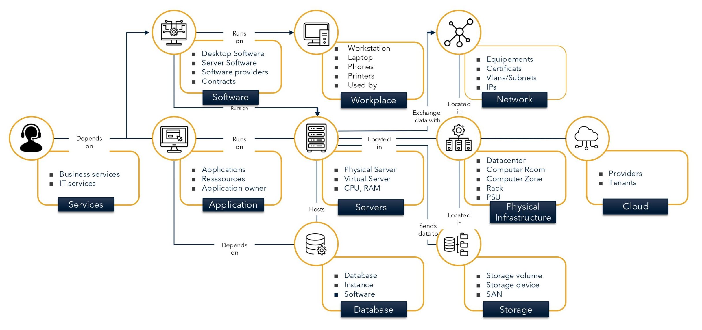 La CMDB centralise et référence les composants de toute nature de votre Système d’Information en s’appuyant sur un modèle de données relationnel très structuré, mettant en évidence les relations réelles entre ces composants. De fait, la CMDB en tant que référentiel unique et intégré, se positionne comme la source de vérité des composants de votre Système d’Information.